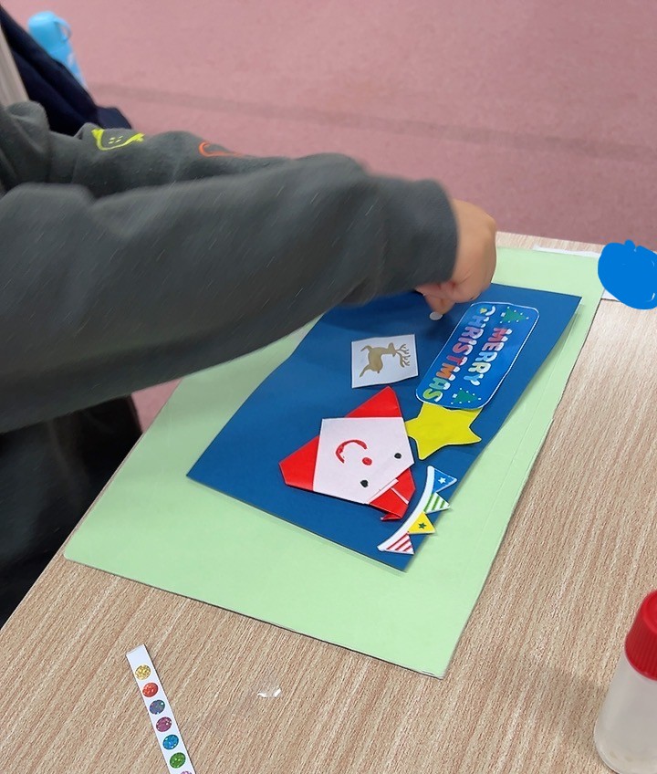 作り方の説明を聞き、サンタさんの折り紙や飾りつけをしました♪
