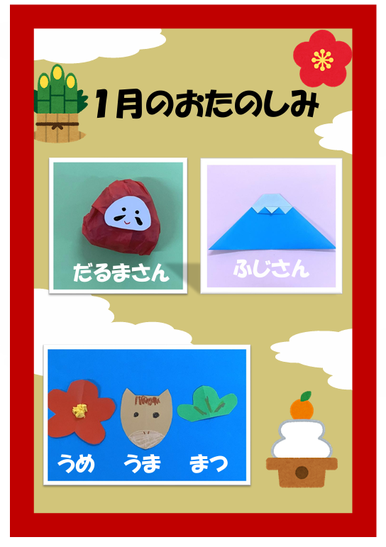 初めに、月替わり工作についてです。今月は「だるまさん」「ふじさん」「うめ・うま・まつ」です🗻