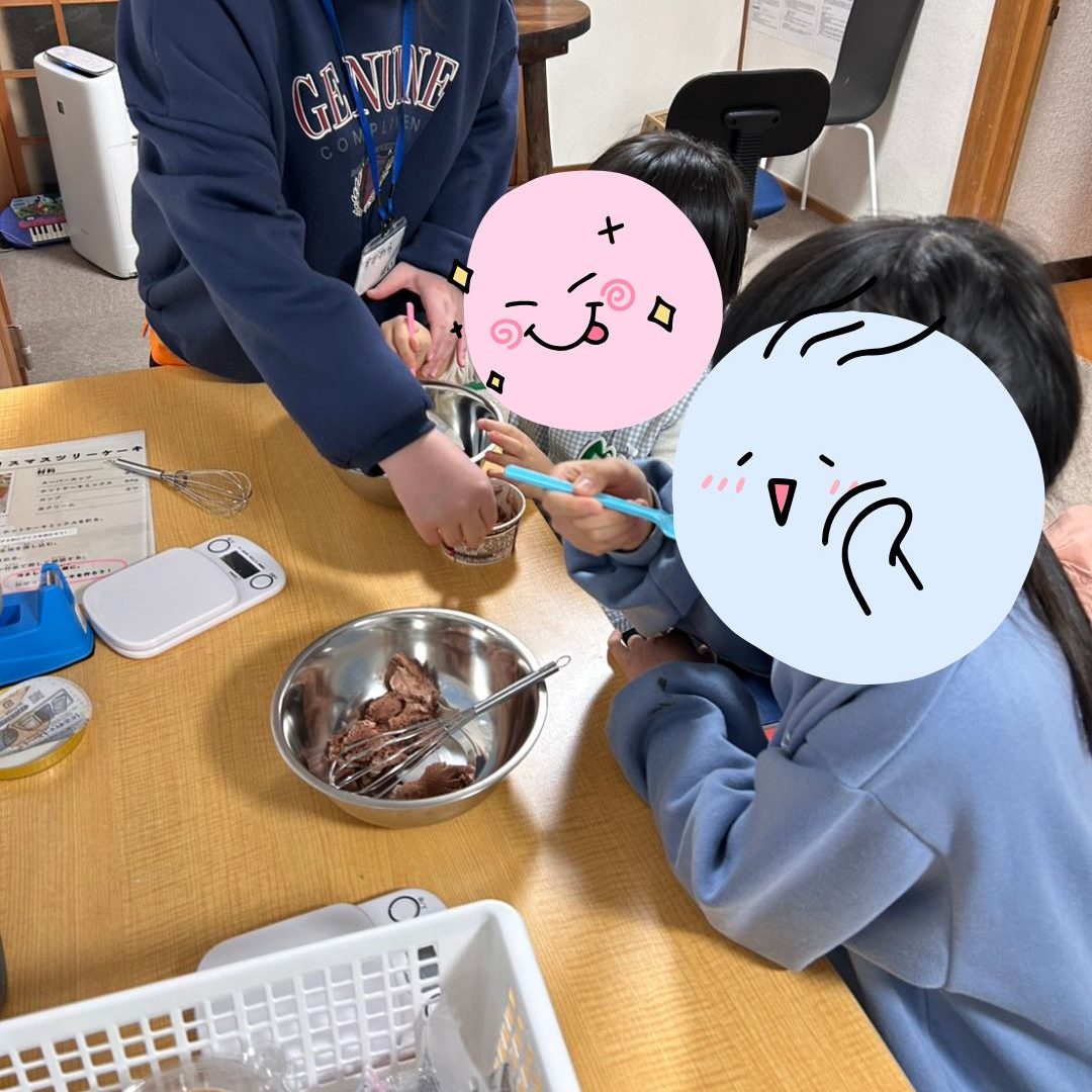 計量の途中でアイスやチョコフレークをつまみ食いしながら、「おいしいね」とお話ししつつ、お菓子作りを楽しんでいました😂