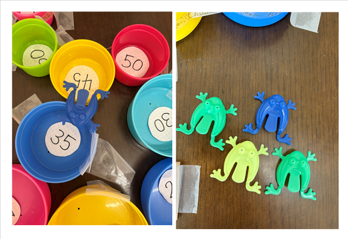 かえるは ぜんぶで 4ひき。5回とばすことができて、最後は得点はばいになります。