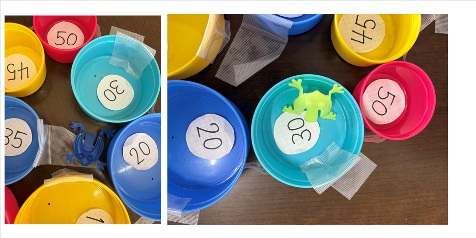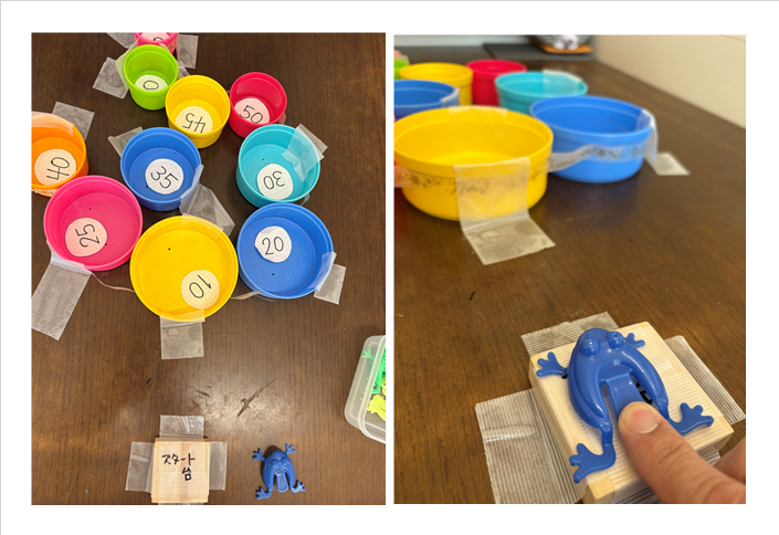 かえるは ぜんぶで 4ひき。5回とばすことができて、最後は得点はばいになります。