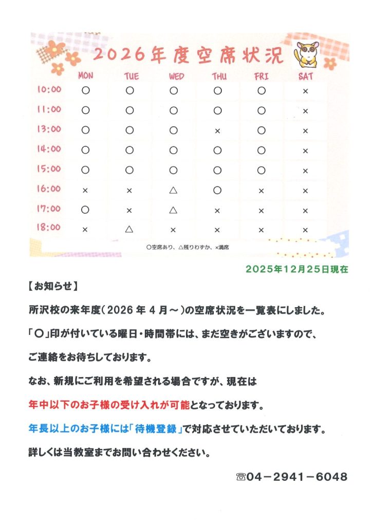 なお、現在ご利用中の方の来年度のご意向によって、空き状況が変更となる場合があります。