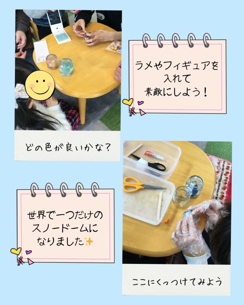 こんばんは!(^^)!先日、ワークショップを開催し、お子様と一緒にスノードームを作りました!!