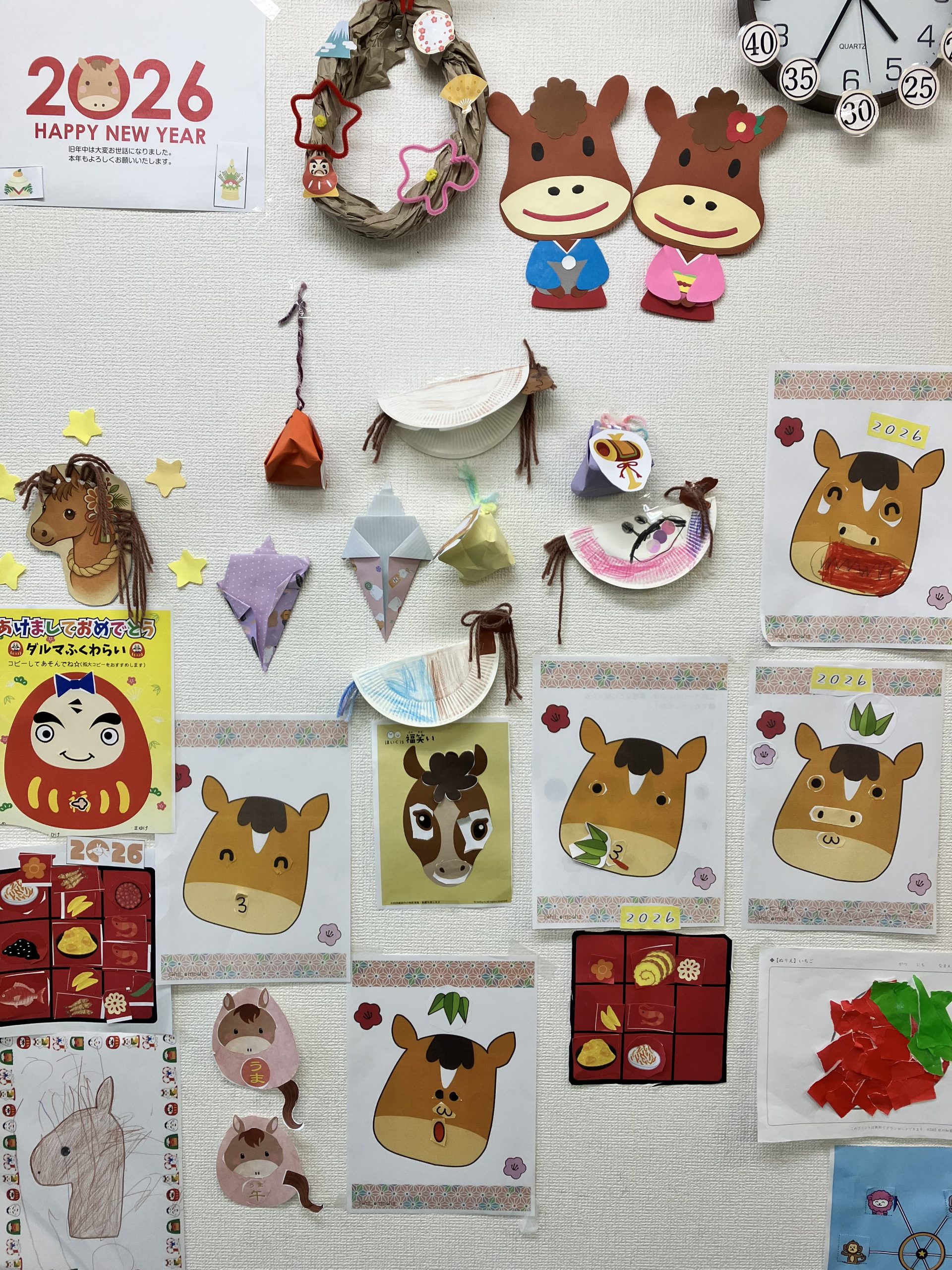 また、お正月制作にも取り組みました。だるまや今年の干支の午🐎をテーマにした制作では、はさみやのりを使った微細運動を行い、個性あふれる作品が完成しました。