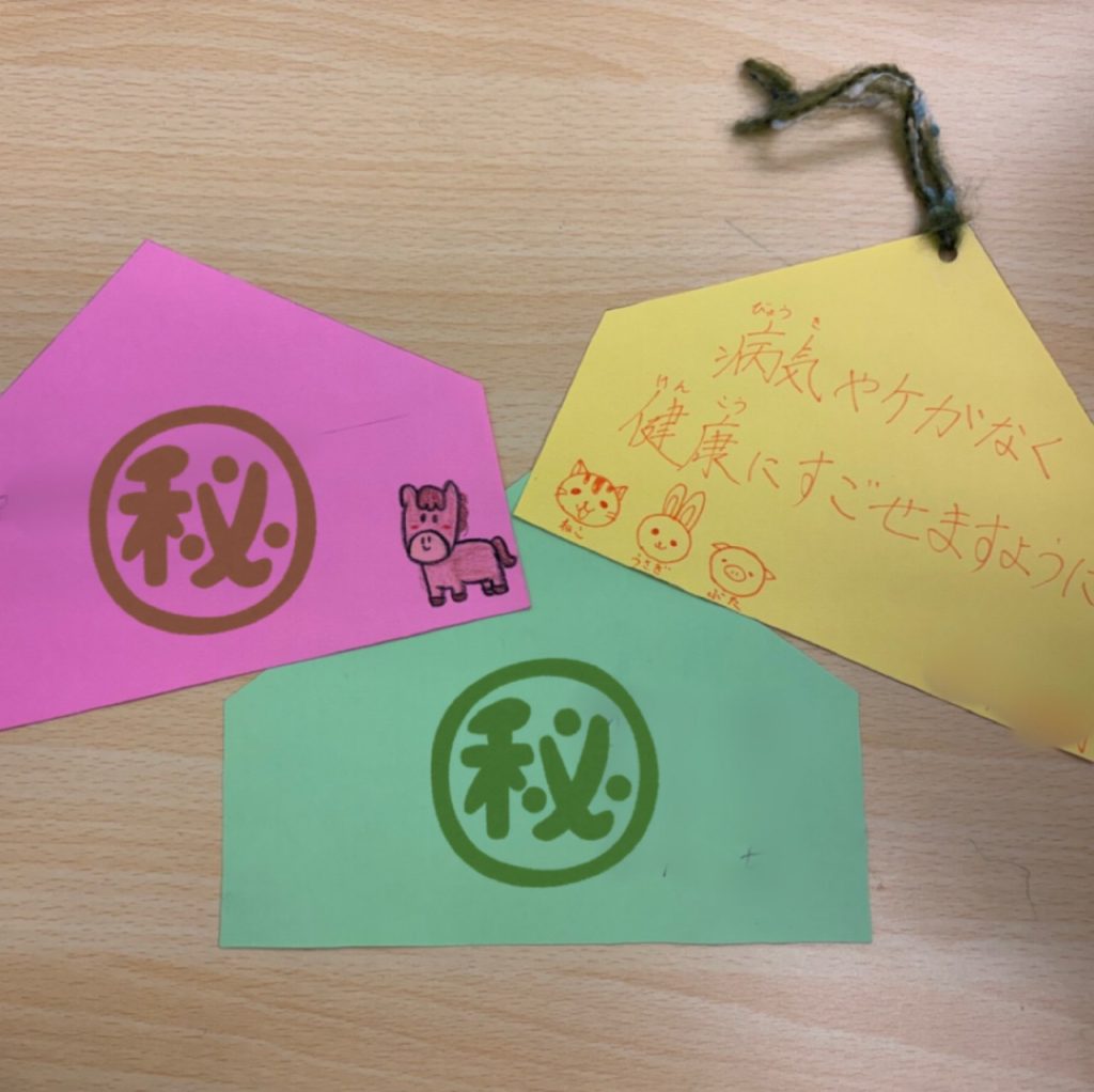 小学生のお子様には、2026年の目標を絵馬風の紙に書いてもらいました🐎