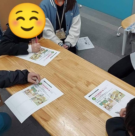 ワークシートでの学習では、家にいる時に緊急地震速報がなった場合、学校にいる時に緊急地震速報がなった場合について、それぞれで取るべき行動を一人ひとりが考え、もしもの時に備えて知識を深めることができました。