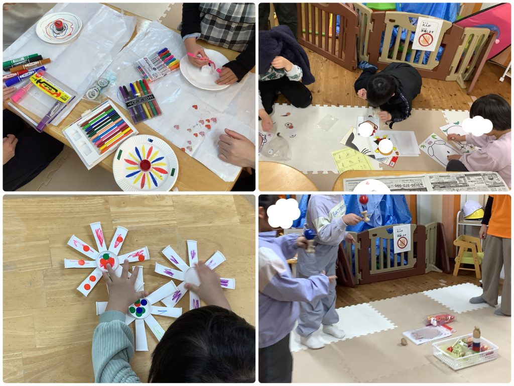 コマを作ったり、かるたやふくわらい、だるま落としやお手玉などの