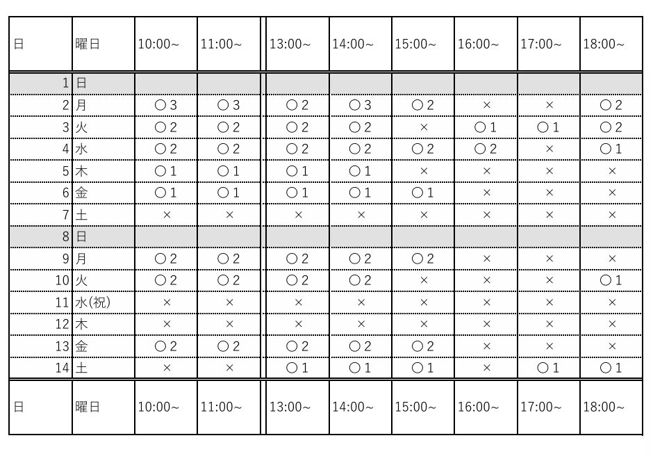 1月27日時点での空き状況のため、変動がある場合がございます。《×》と書かれている枠もご相談ください!