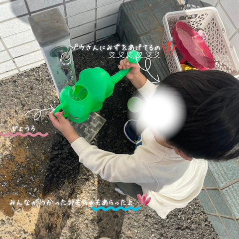 じょうろを手に、「こぼれないようにね」とそっとお水あげ🌱