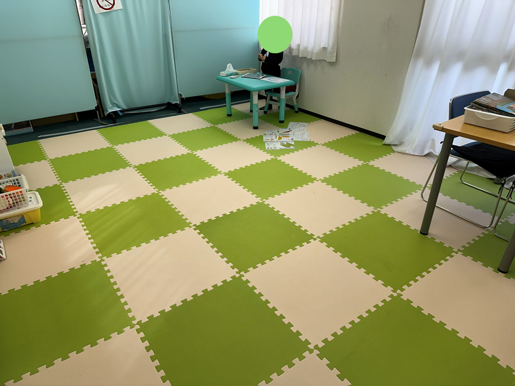 一番大きな部屋に黄緑とうす橙色のマットが敷き詰められ