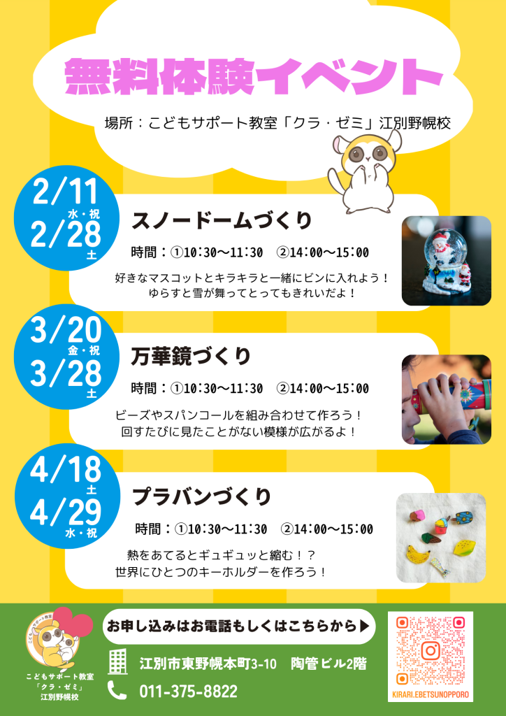 現在、クラ・ゼミ江別野幌校では、見学相談会・イベントの応募を受け付けております!🎉