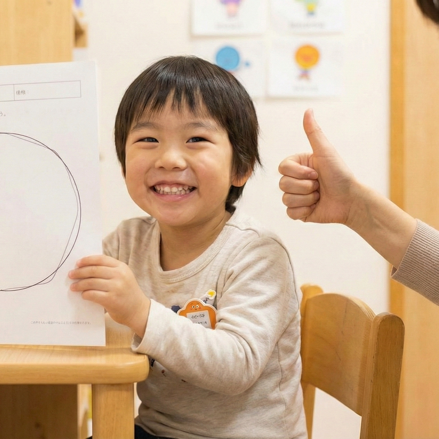 1対1で向き合っているからこそ、指導員はお子さまの「小さな変化」や「がんばり」を見逃しません。 「座っていられたね」「鉛筆を上手に持てたね」と、具体的な行動をその場ですぐに褒めることで、お子さまの中に「自分はできるんだ!」