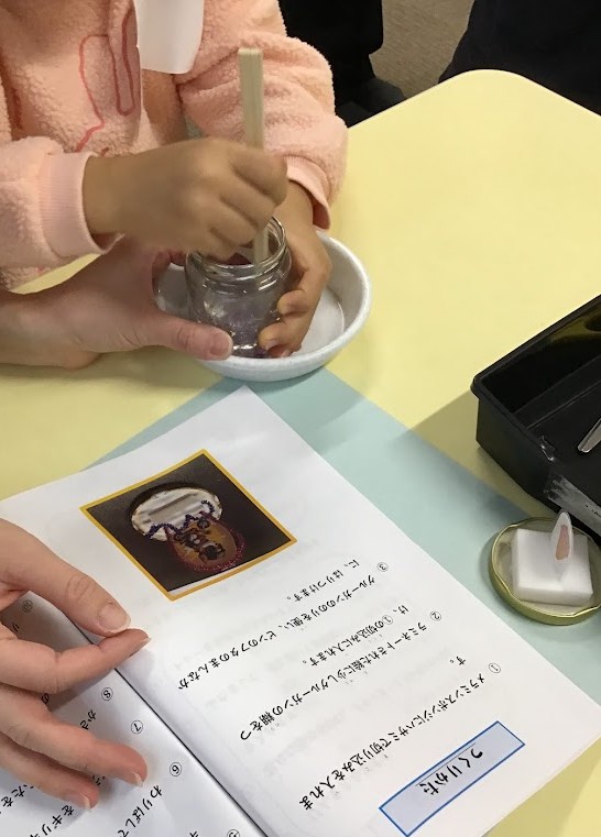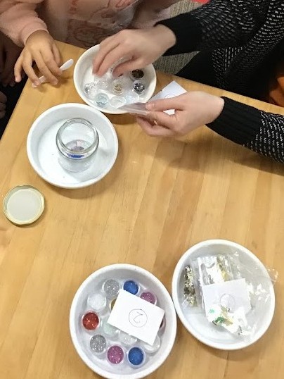 図画工作では、スノードーム作りを親子で協力しながら取り組みました。手順書を見ながら必要な材料と作り方を確認し、製作を進めていきました。自分の好きなラミネートされた絵やスパンコール、グリッターを選び、素敵な作品を完成させることができました⛄
