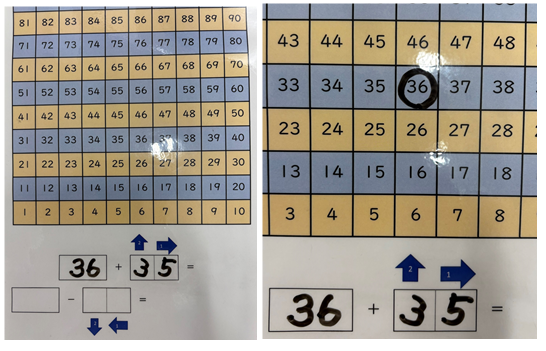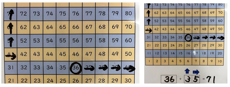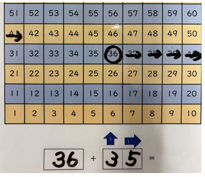 「36」から足す数の「35」の1の位の5個分右へ移動させます。40まで行ったら残りの1は上の段に上がります。これが「くりあがり」です。「36から4つ右へ進んだら残りの1だけ上の段へ」ということを意識させます。