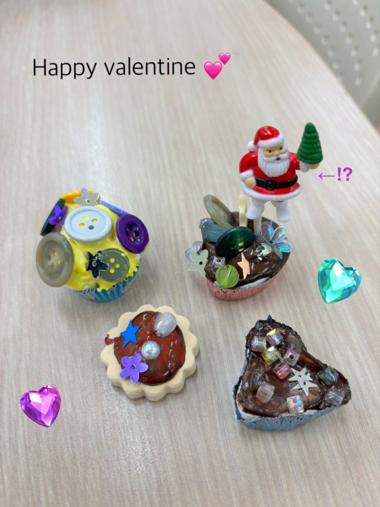 チョコはアルミカップに粘土を詰めてチョコソースをかけてデコレーションしたら完成!…それにしてもこのチョコなんだか懐かしくありませんか?🤣子どもの頃作ったよね~!と職員の間で盛り上がっていました。
