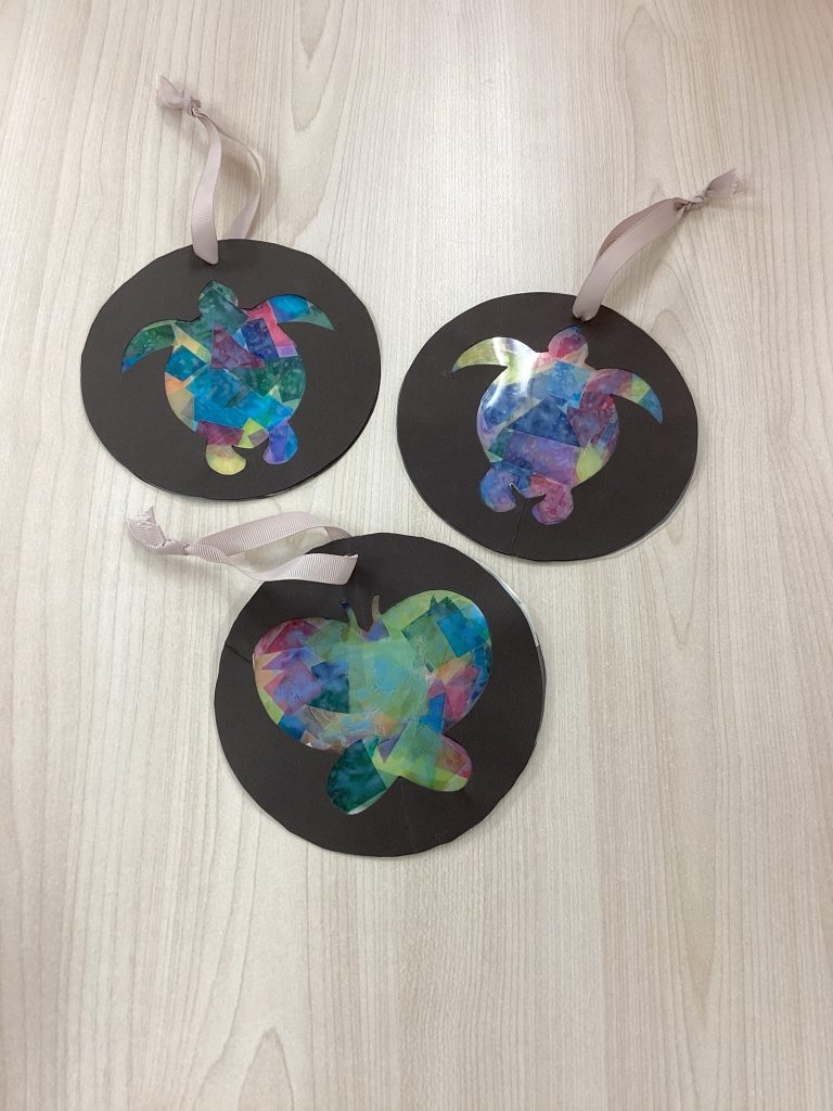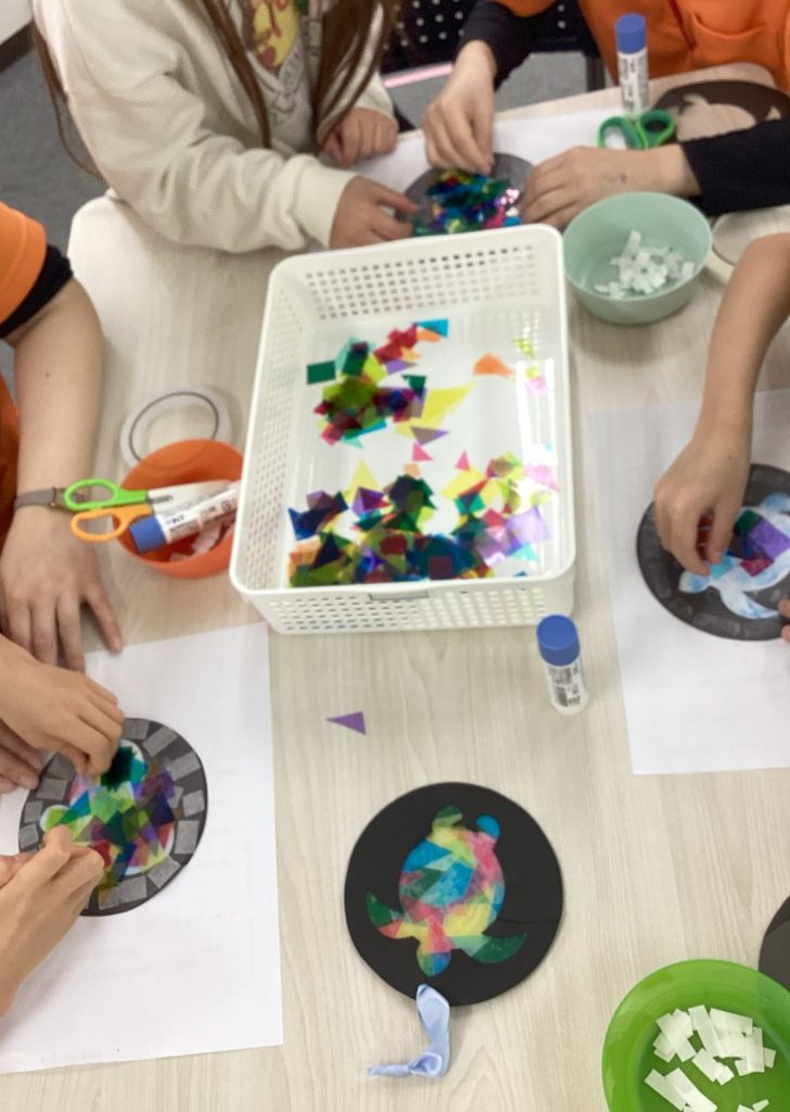 みなさん、素敵に作ってくれましたね!👍カラーセロハンで作っているため、中央部分が透けて、光に当てるととってもきれいです!🤩