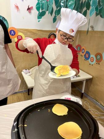 卵を割ったり、粉を混ぜたり、ホットプレートで焼いたり色々な体験ができました。