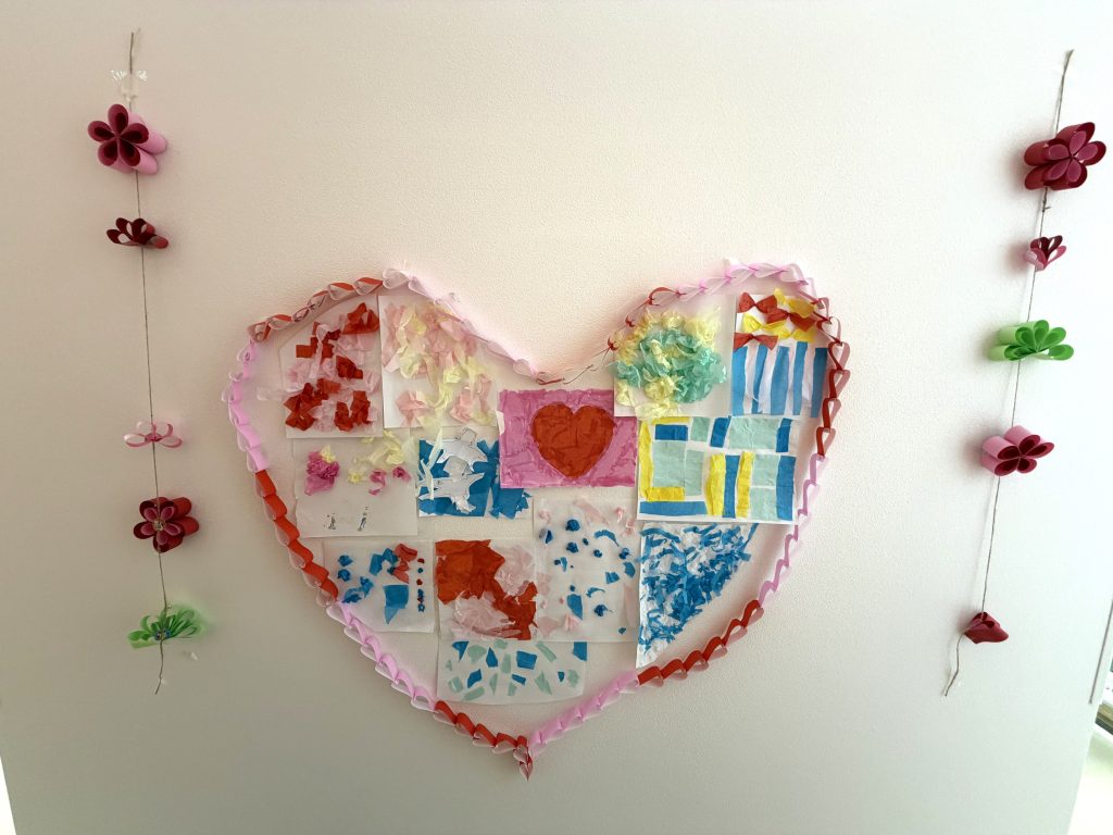 輪っかで作った大きなハートの枠に、
