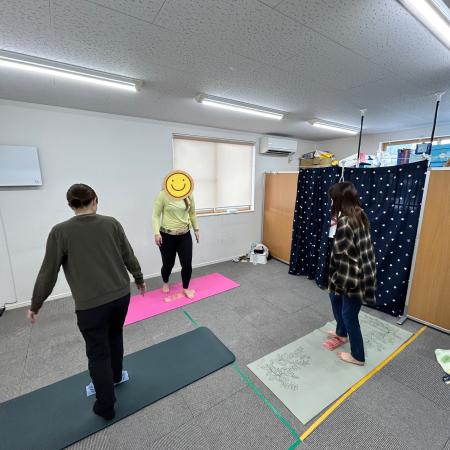 2名の保護者の方にご参加していただき、前半は下半身中心のストレッチや足ツボ刺激をし、後半は音楽に合わせて青竹を踏んでいきました。