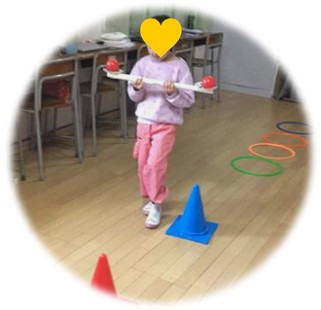 ボールをお皿の上に乗せて落とさずにバランスを取りながら歩きます。