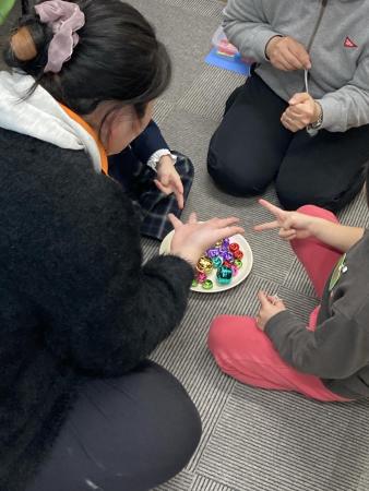 色を使った神経衰弱や、指先でロケットを飛ばすゲーム、自分の色の鈴を取るゲームなど様々なゲームを行いました。