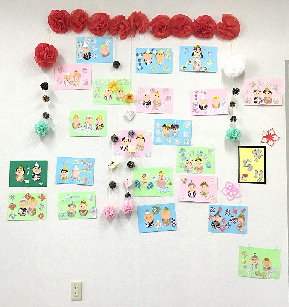 完成したおひなさまは玄関に飾り、とても華やかな壁面になっていますので、来所された際はぜひ見てみてください🙌