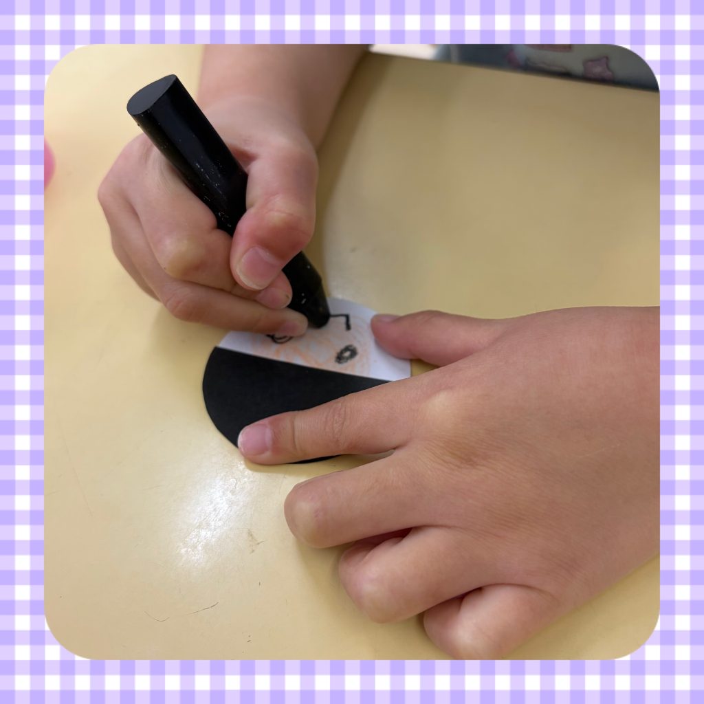 お顔の部分は画用紙に黒い折り紙を貼り、クレヨンでお顔を書いてもらいます🖍