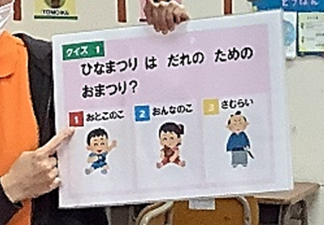 「さあ、今日は女の子のためのお祭り、『ひなまつり』の日です。」と言って開始し、すぐに下の問題をだしました。