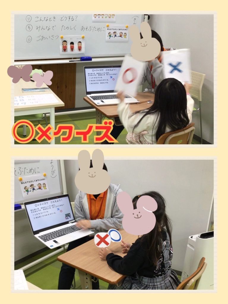 「コミュニケーション」のテーマでは、「こんなときどうする?」、「自分の気持ちと相手の気持ち」、「ありがとうとごめんなさい」、「ふわふわ言葉とちくちく言葉」 について、お勉強しました🍀