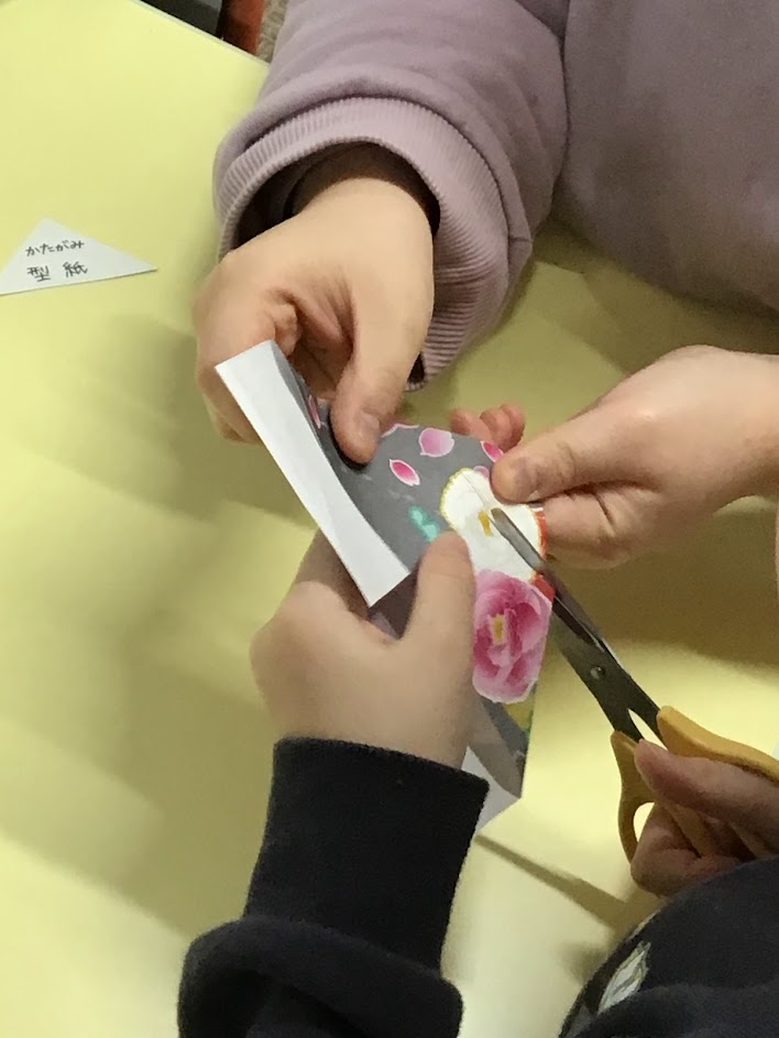 花の模様が書かれた細長い紙を半分に折り、広げます。両端を中央の線までそれぞれ斜めに折ります。線がずれないように中央の線をよく見て折る様子が見られました✨ 上の三画の部分に型紙を合わせて線を引き、引いた線をはさみで切ります✂️