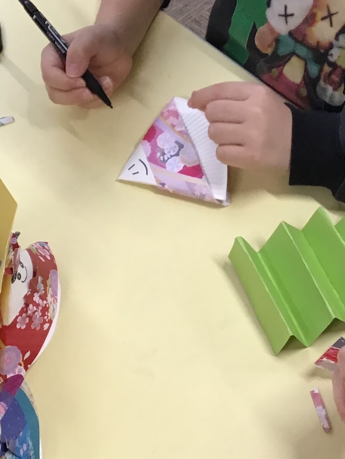 お内裏様の笏と冠を2番で出た切れ端を細長く丸めて作りました。また、お雛様は、画用紙で作った冠を頭にのりでつけ、扇は切れ端を利用してはさみで切って作りました。指先を使った細かい作業が沢山ありましたが、最後まで一生懸命取り組むことができました👍