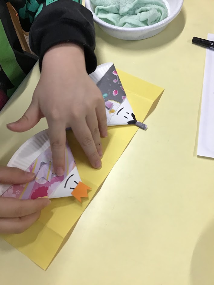 半分に切った紙皿を三画の形になるように折ってセロハンテープで貼ります。紙皿が動かないように片方の手で押さえながらセロハンテープを貼るのは少し指先の力が必要な作業でしたが、しっかり押さえてとめることができました☝️
