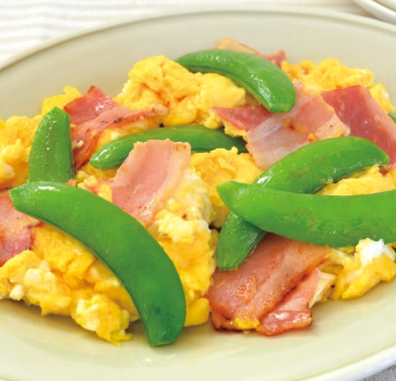 メニューは…「ベーコンとスナップエンドウのたまご炒め」です✨️