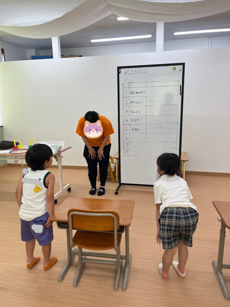 上浅田校の支援では始めに必ずあいさつをします。これはきらりに限らず幼稚園や学校の授業でも活動の始まりを意識するために行われてると思います。ねらいとしては他にも、大人や友達とのコミュニケーションをとることや社会性を身につけることなどが挙げられます。