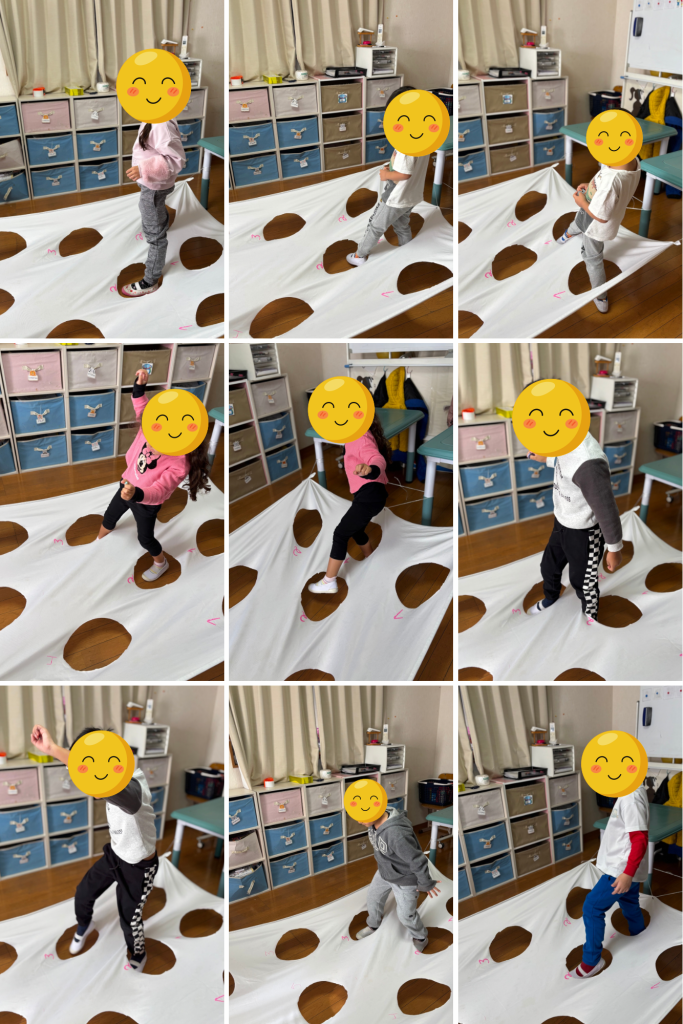 Durante a proposta, foram estimuladas habilidades importantes como a coordenação motora, equilíbrio, noção corporal, flexibilidade e organização espacial. Ao decidir por qual buraco passar a perna, as crianças precisaram planejar movimentos, controlar o corpo e ajustar posições para manter a estabilidade, desenvolvendo força, foco e atenção.