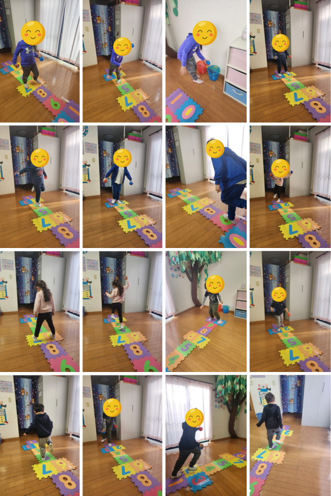 A atividade estimulou a coordenação motora ampla por meio dos saltos, o equilíbrio e a noção espacial, além da coordenação motora fina e do controle dos movimentos ao segurar as bolinhas. Também favoreceu o reconhecimento e a discriminação das cores, a concentração, a atenção e o respeito às regras da brincadeira.
