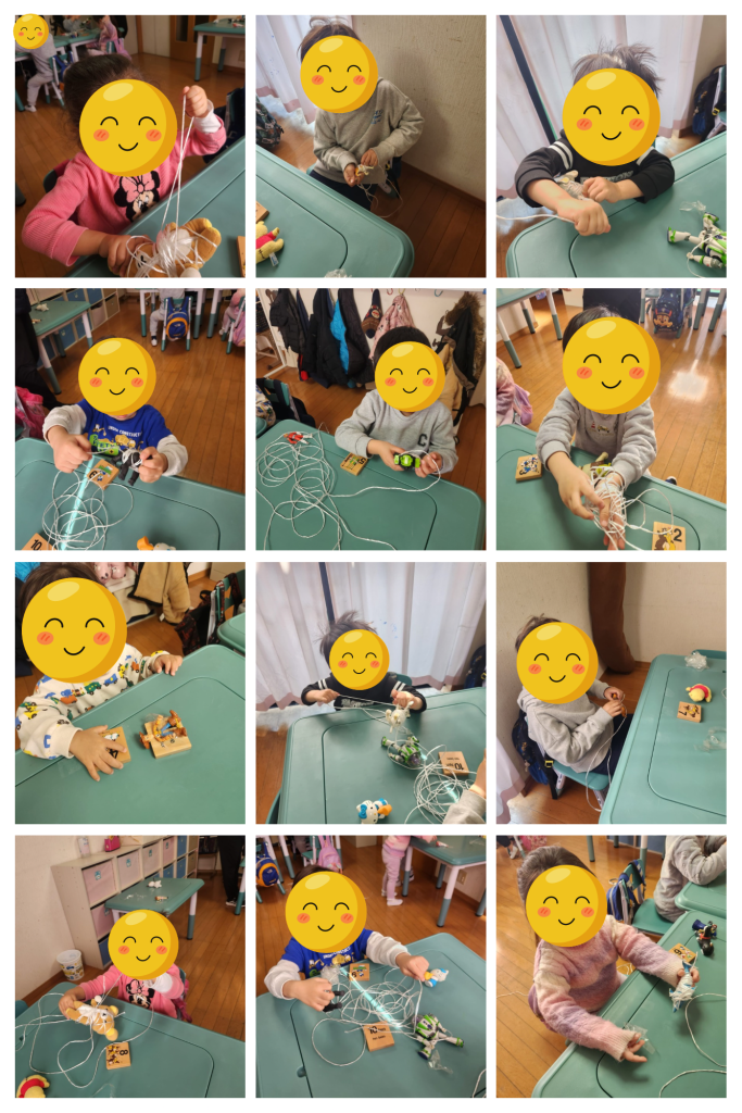 Cada criança recebeu brinquedos com barbante enrolado e foi desafiada a desenrolá-lo com cuidado e atenção. Durante a atividade, foram estimuladas a coordenação motora fina, a concentração, a paciência e a coordenação olho-mão.