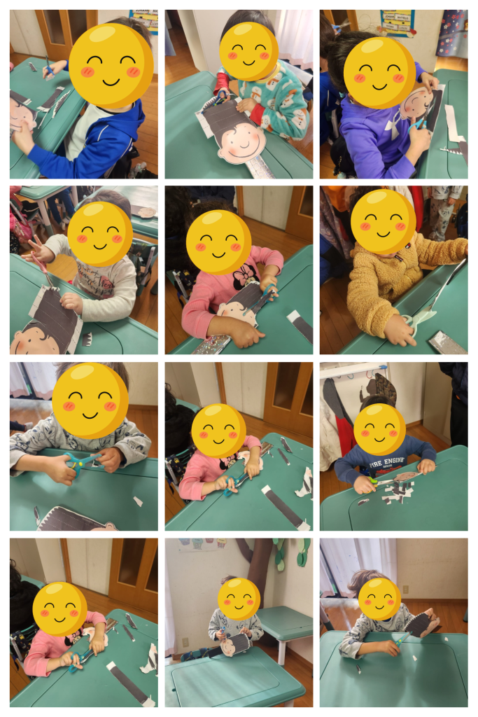 Durante a atividade, as crianças exploraram o recorte seguindo os contornos, estimulando também a criatividade e a percepção visual, de forma lúdica e segura.