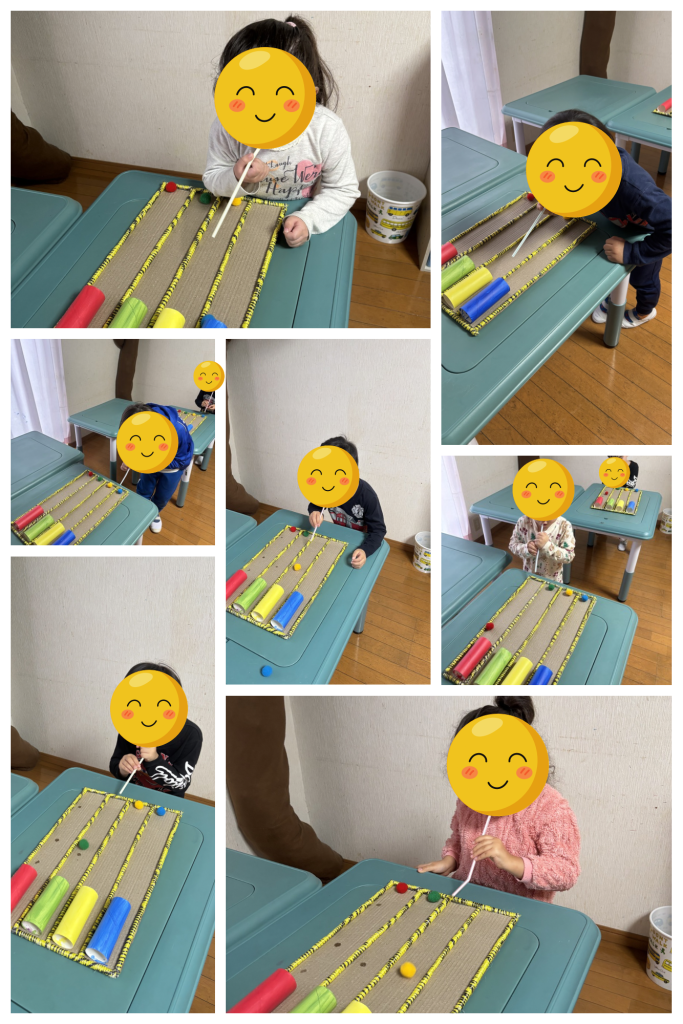As crianças se envolveram com entusiasmo, explorando diferentes intensidades de sopro para conseguir movimentar o pompom e completar o desafio.
